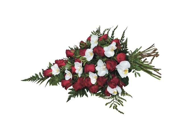 Enkel bårebukett med variasjoner av røde og hvite blomster. (bildet er kun som illustrasjon)