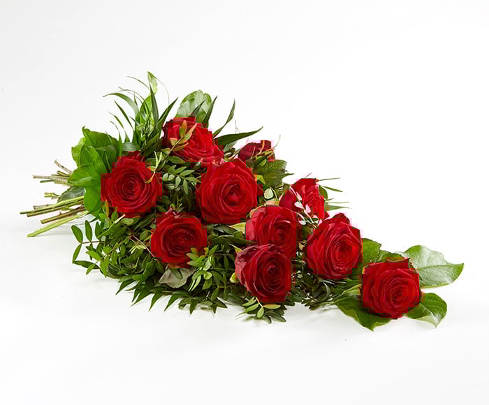 En fin bårebukett med variasjon av røde blomster (bilde er kun til illustrasjon)